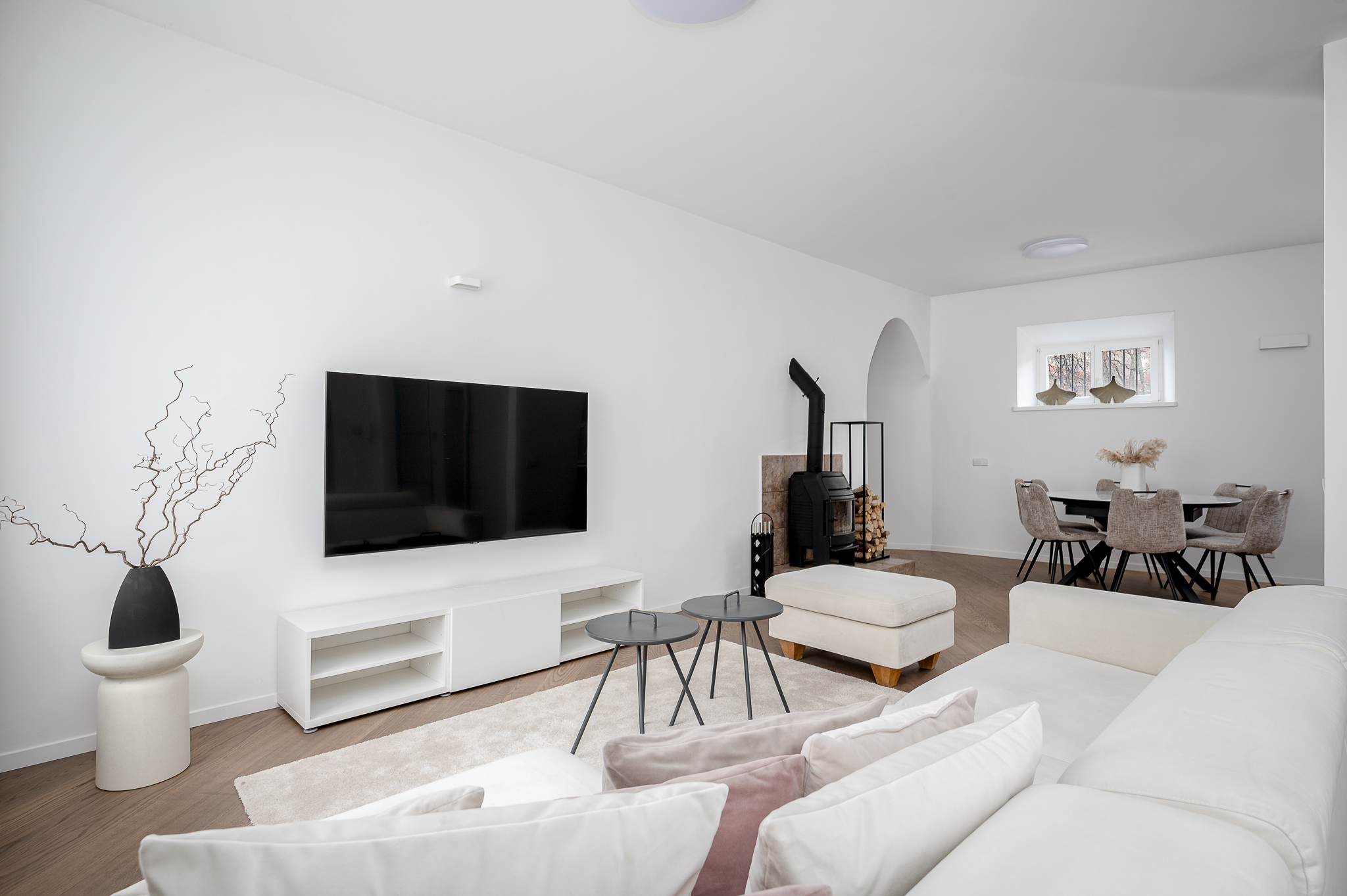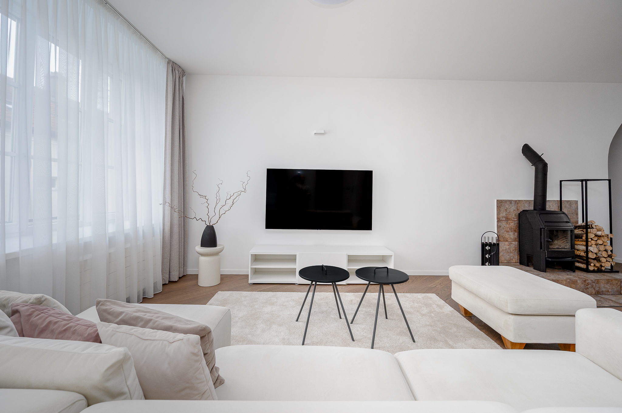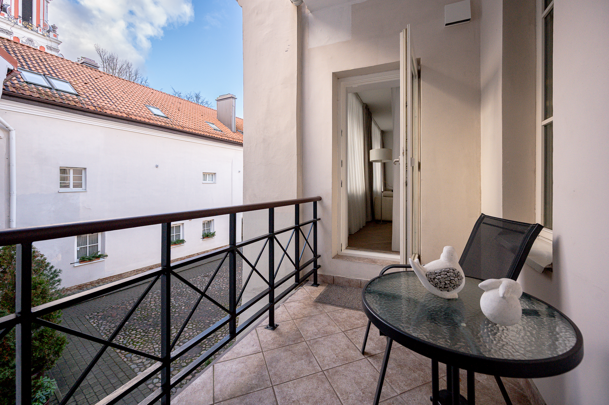 Two-bedroom apartments with balcony, fireplace, hall and view to the inner courtyard.