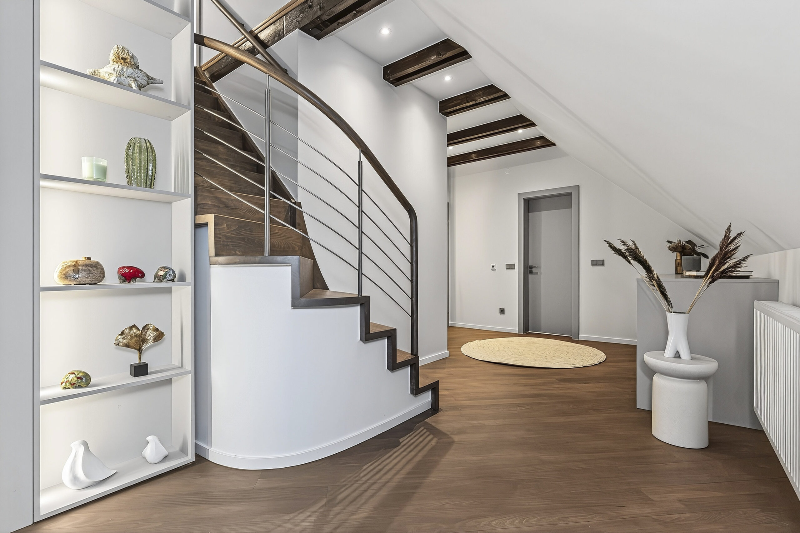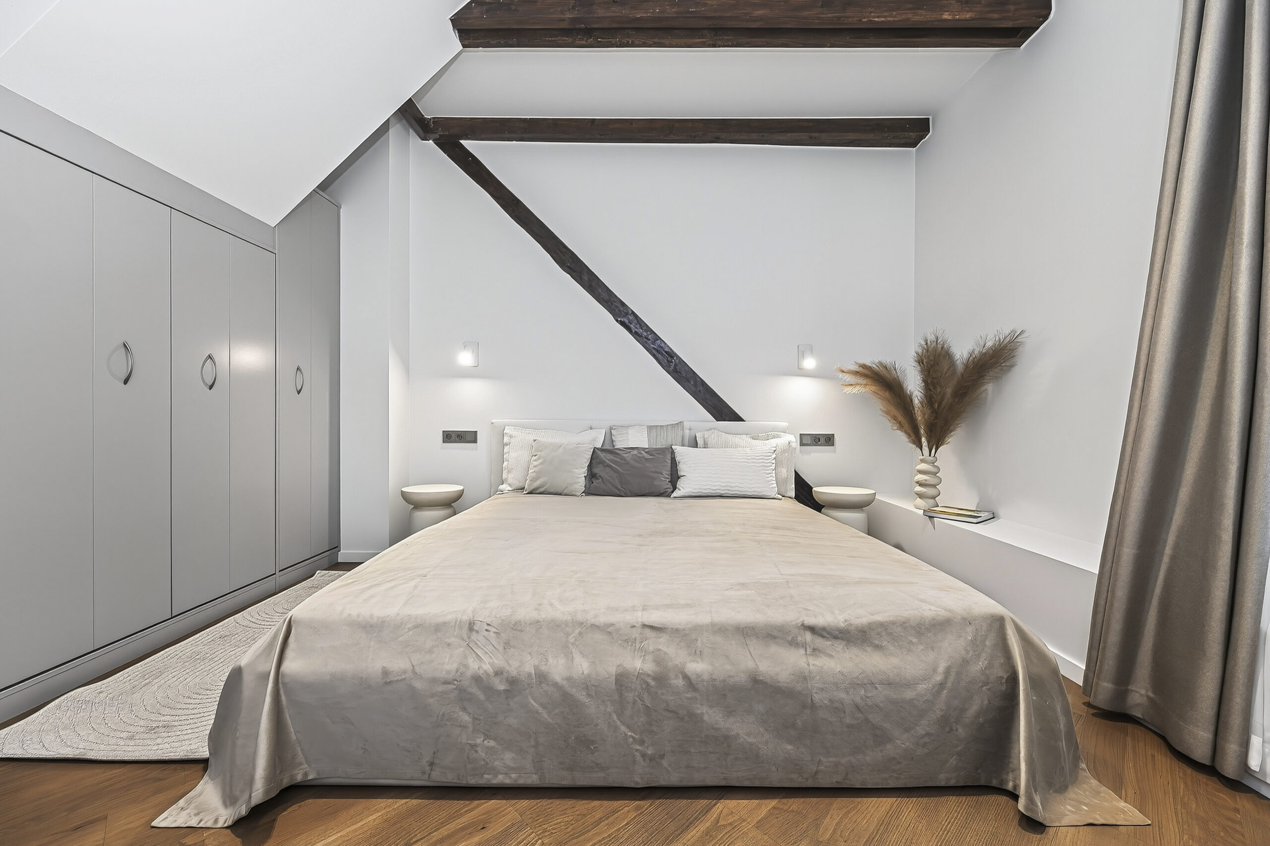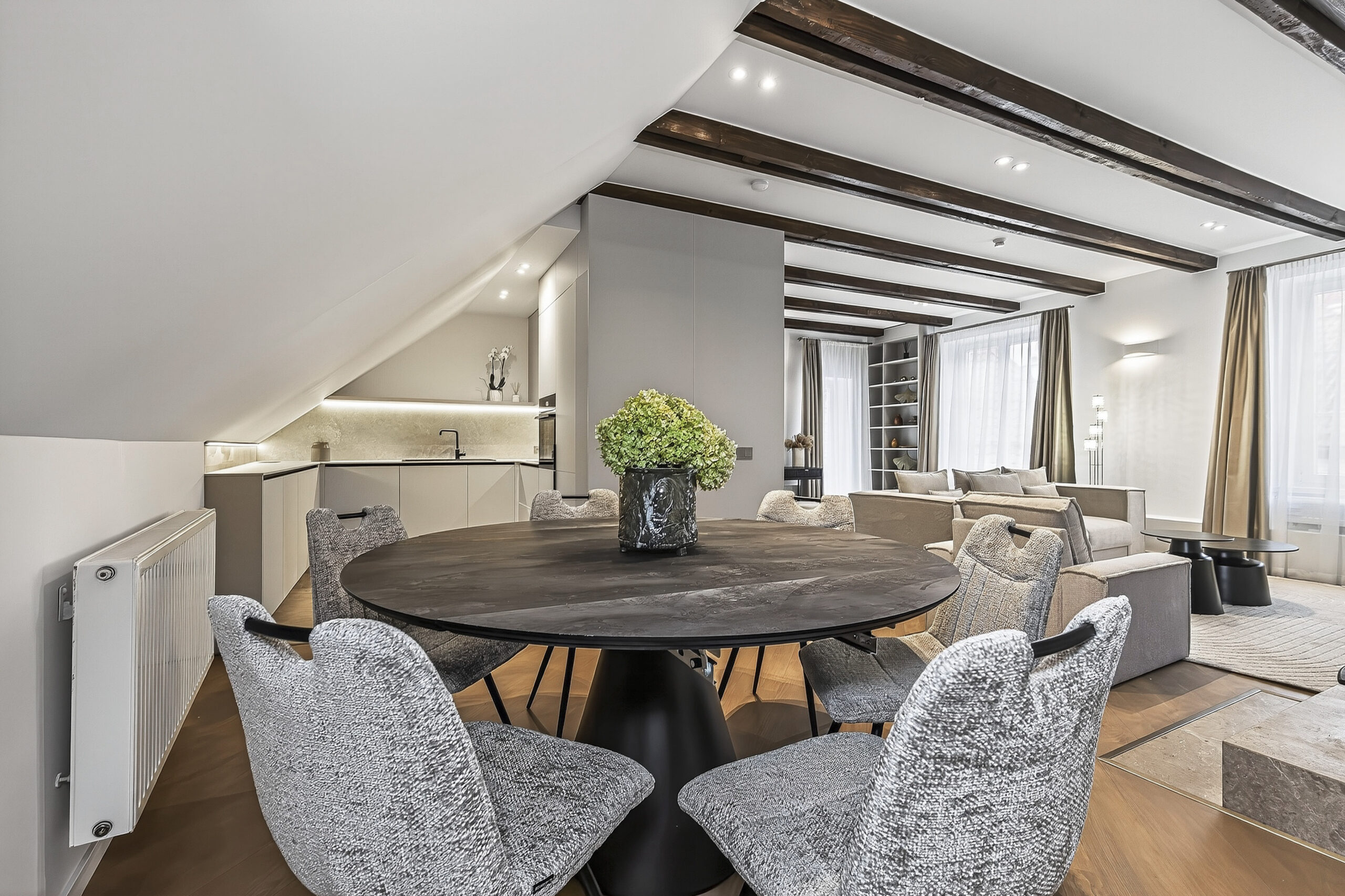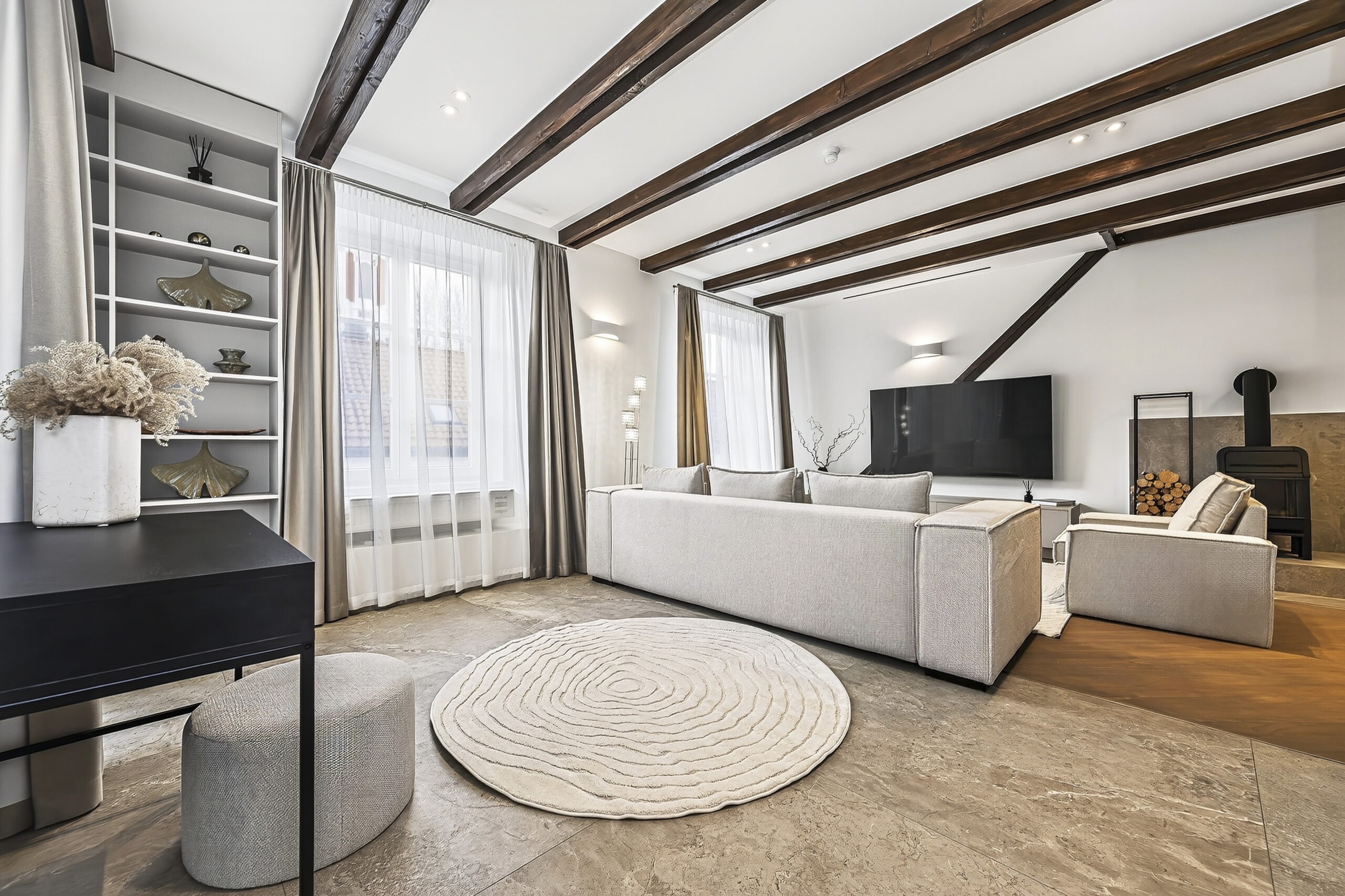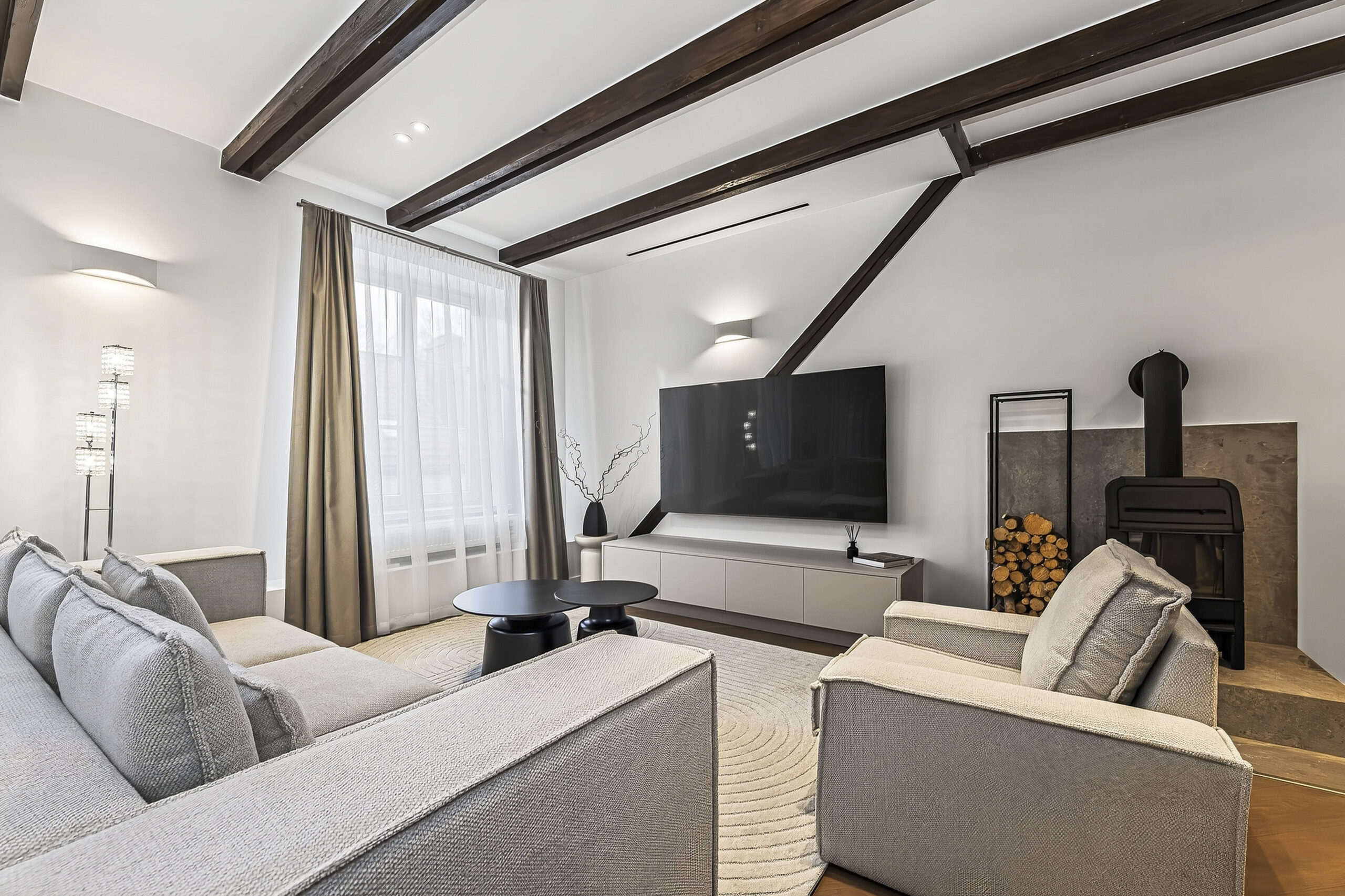 Apartment is cozy and spacious with four separate bedrooms, three bathrooms, has two floors, balcony, fireplac